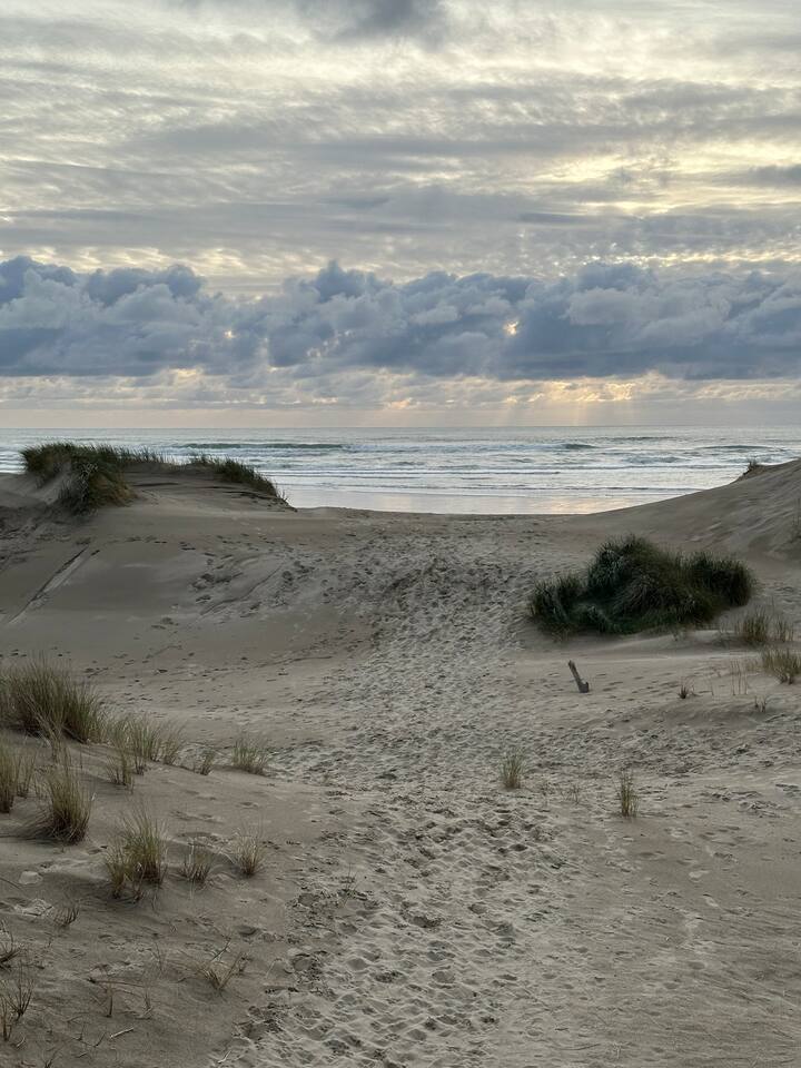 🧙♂️🌲 🏖️ The local “hobbit trail” to the beach begins about 100 feet from the front door. It’s a fun 1/3-mile walk (7–10 minutes) through a charming forest path that feels straight out of a storybook. Along the way, you’ll cross a couple of sandy dunes — a little bit of a climb, but nothing too wild (though little legs and tired knees might need a hand!). For an easier route, Heceta Beach County Park is just ½ mile away and offers both free and paid parking.